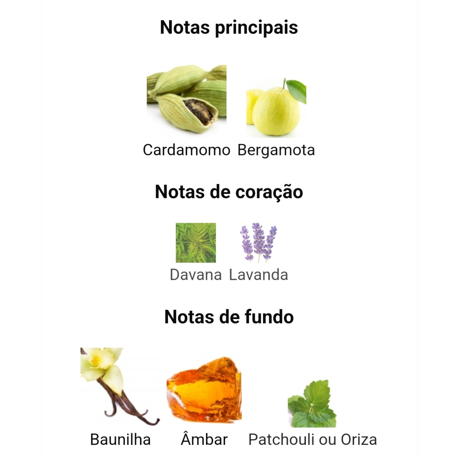 As notas de topo são cardamomo e bergamota; as notas de coração são Davana e Lavanda; As notas de fundo são Baunilha, Âmbar e Patchouli ou Oriza.