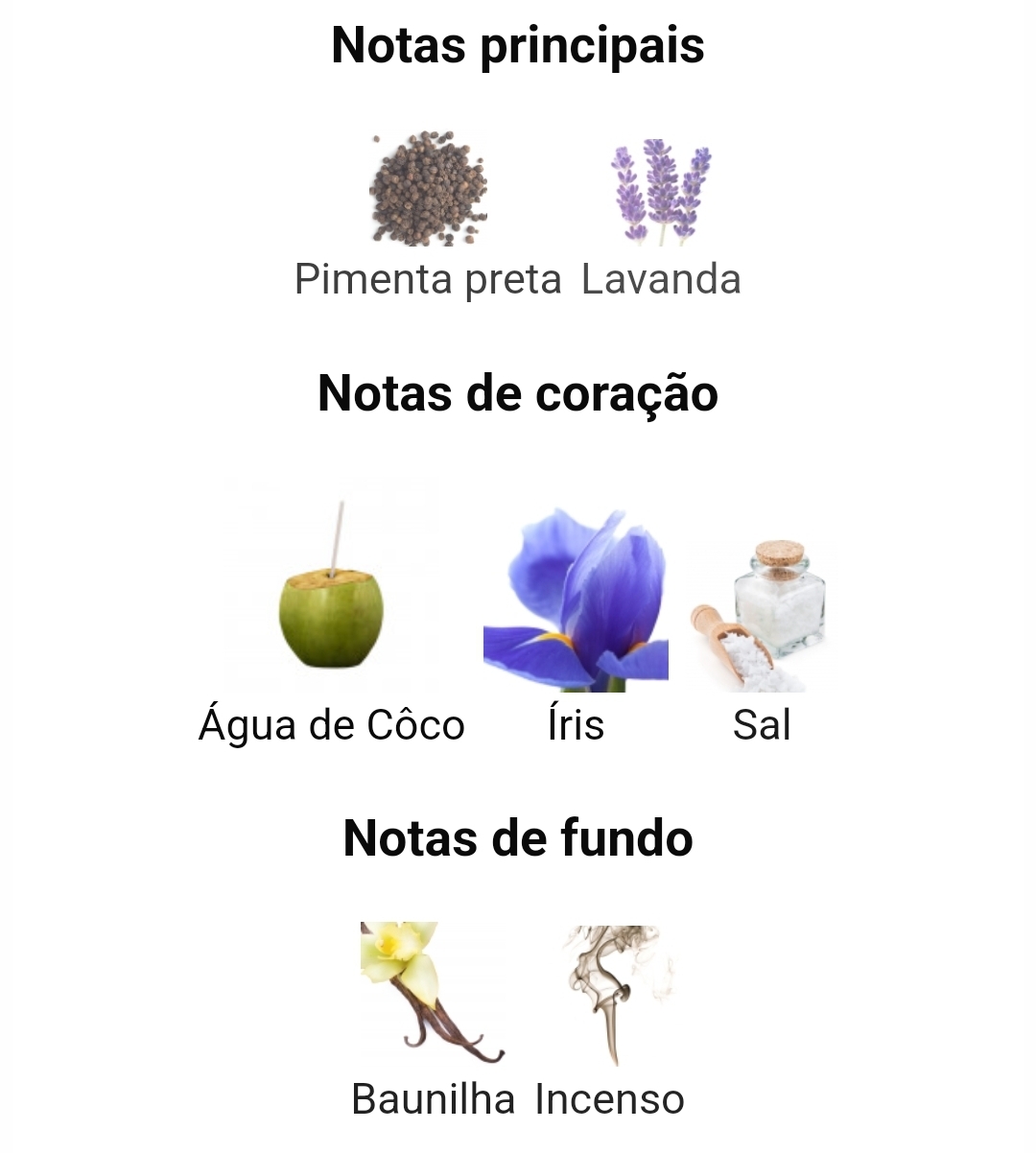 As notas de topo são pimenta preta e lavanda; as notas de coração são água de coco, íris e sal; as notas de fundo são Baunilha e Incenso
