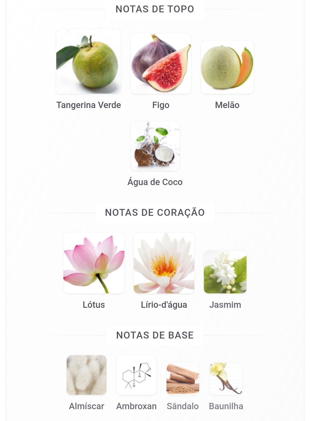 As notas de topo são: Tangerina Verde, Figo, Melão e Água de Coco. As notas de coração são: Lótus, Lírio-d'água e Jasmim. As notas de fundo são: Almíscar, Ambroxan, Sândalo e Baunilha.