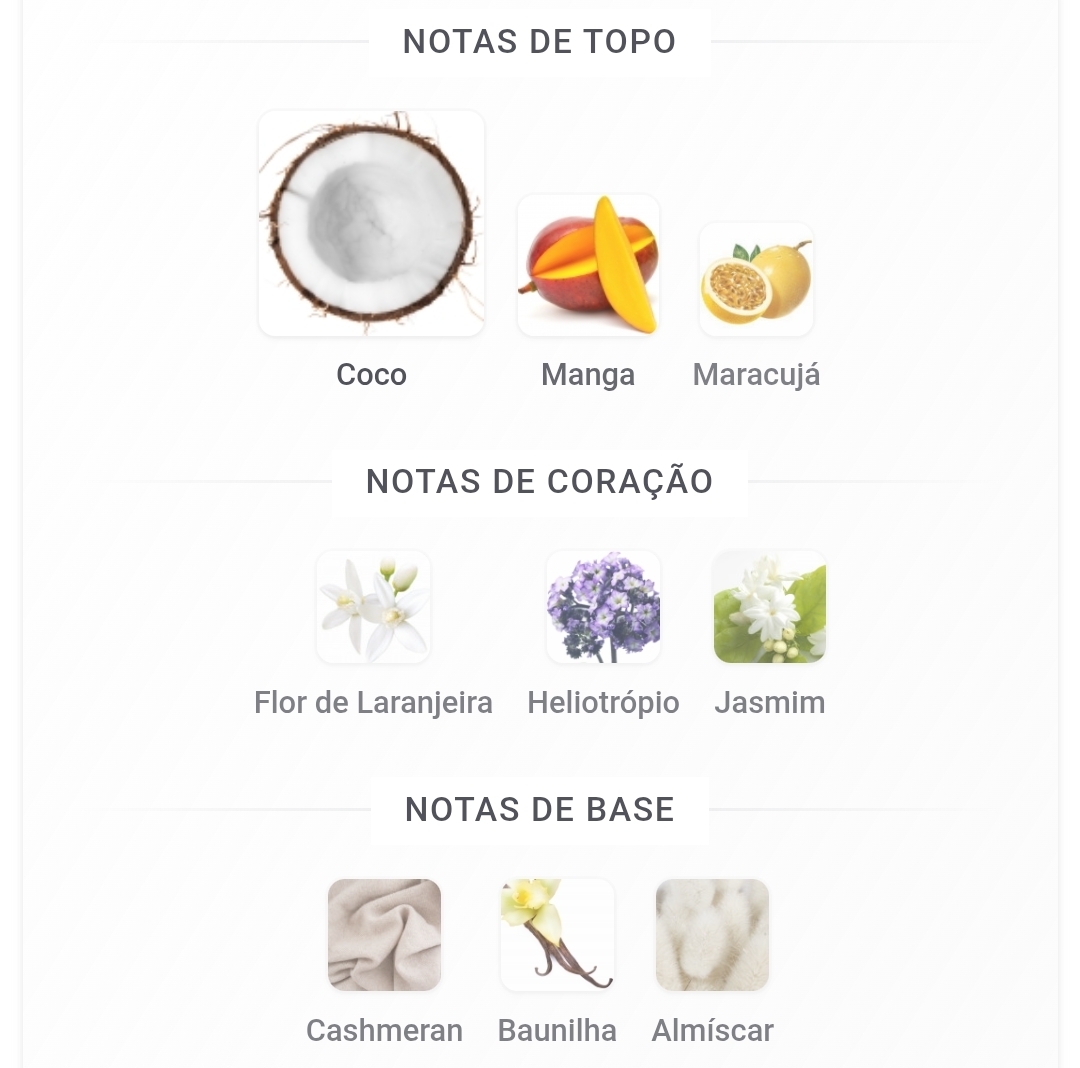 As notas de topo são: Coco, Manga e Maracujá. As notas de coração são: Flor de Laranjeira, Heliotrópio e Jasmim. As notas de fundo são: Cashmeran, Baunilha e Almíscar.