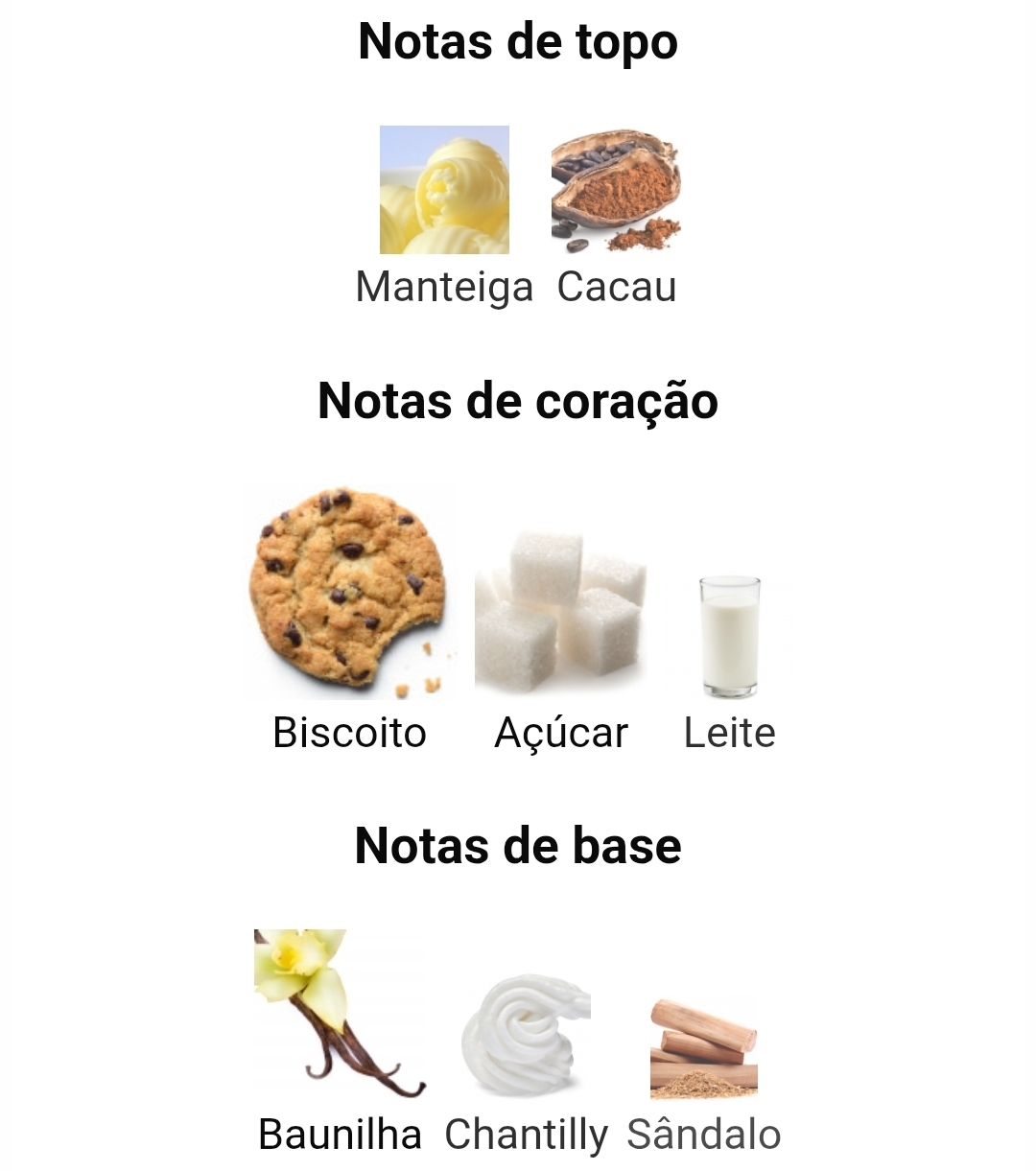 As notas de topo são manteiga e cacau; as notas de coração são biscoito, açúcar e leite; as notas de fundo são baunilha, chantilly e sândalo.