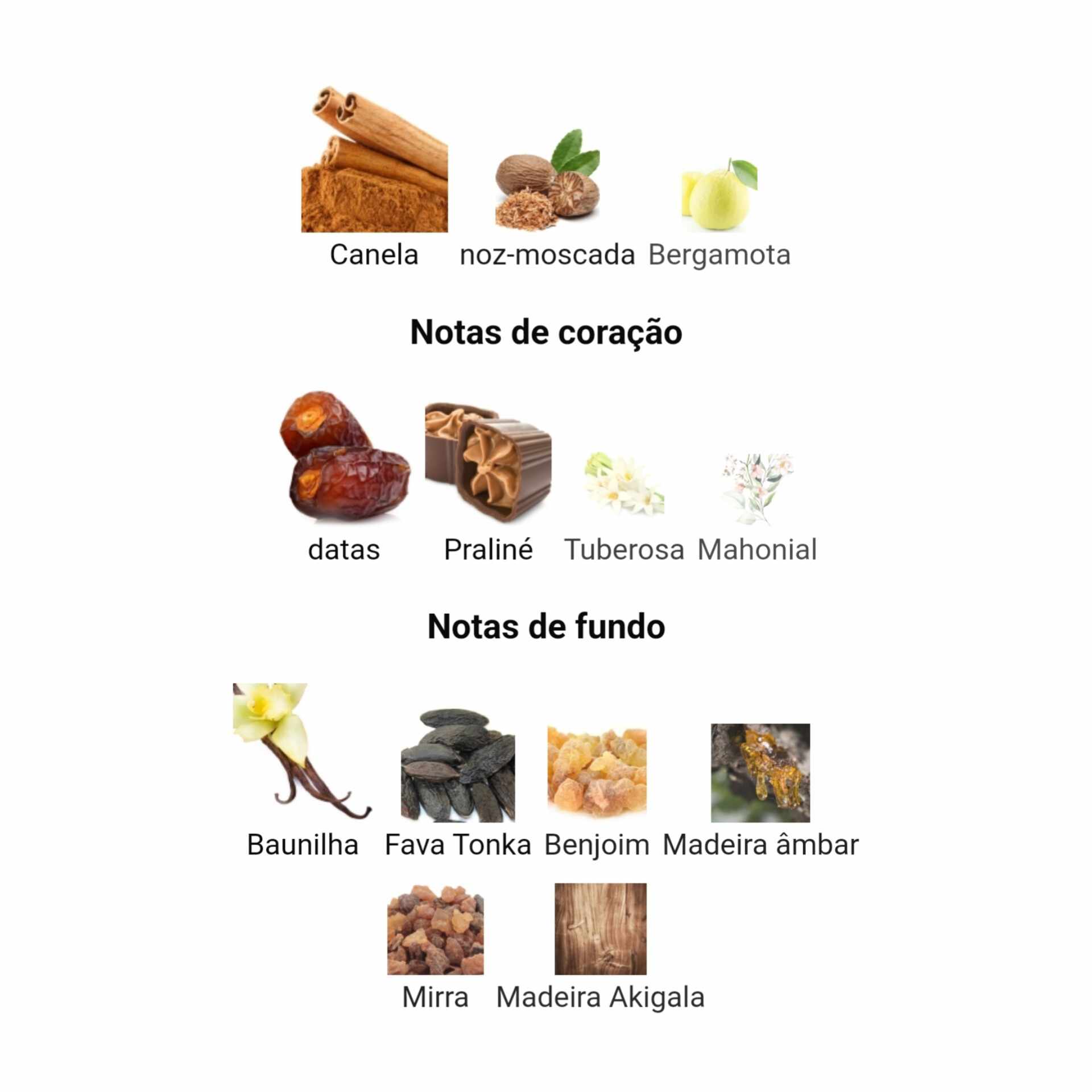 As notas de topo são canela, noz-moscada e bergamota; as notas de coração são Tâmaras, Praliné, Tuberosa e Mahonial; As notas de fundo são Baunilha, Fava Tonka, Benjoim, Madeira de âmbar, Mirra e Madeira de Akigala.