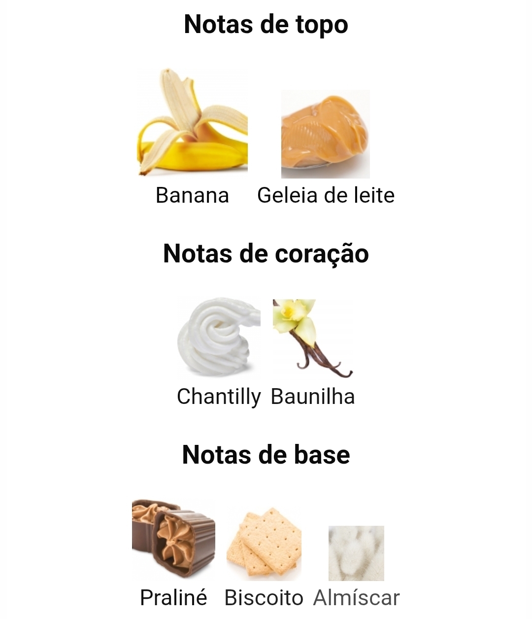 As notas de topo são banana e doce de leite; as notas de coração são chantilly e baunilha; as notas de fundo são pralinê, biscoito e almíscar.