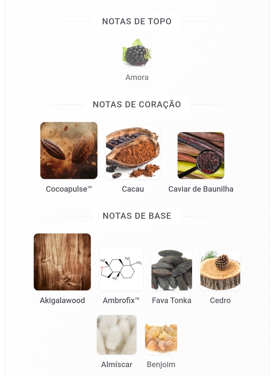 A nota de topo é: Amora. As notas de coração são: Cocoapulse™, Cacau e Caviar de Baunilha. As notas de fundo são: Akigalawood, Ambrofix™, Fava Tonka, Cedro, Almíscar e Benjoim.