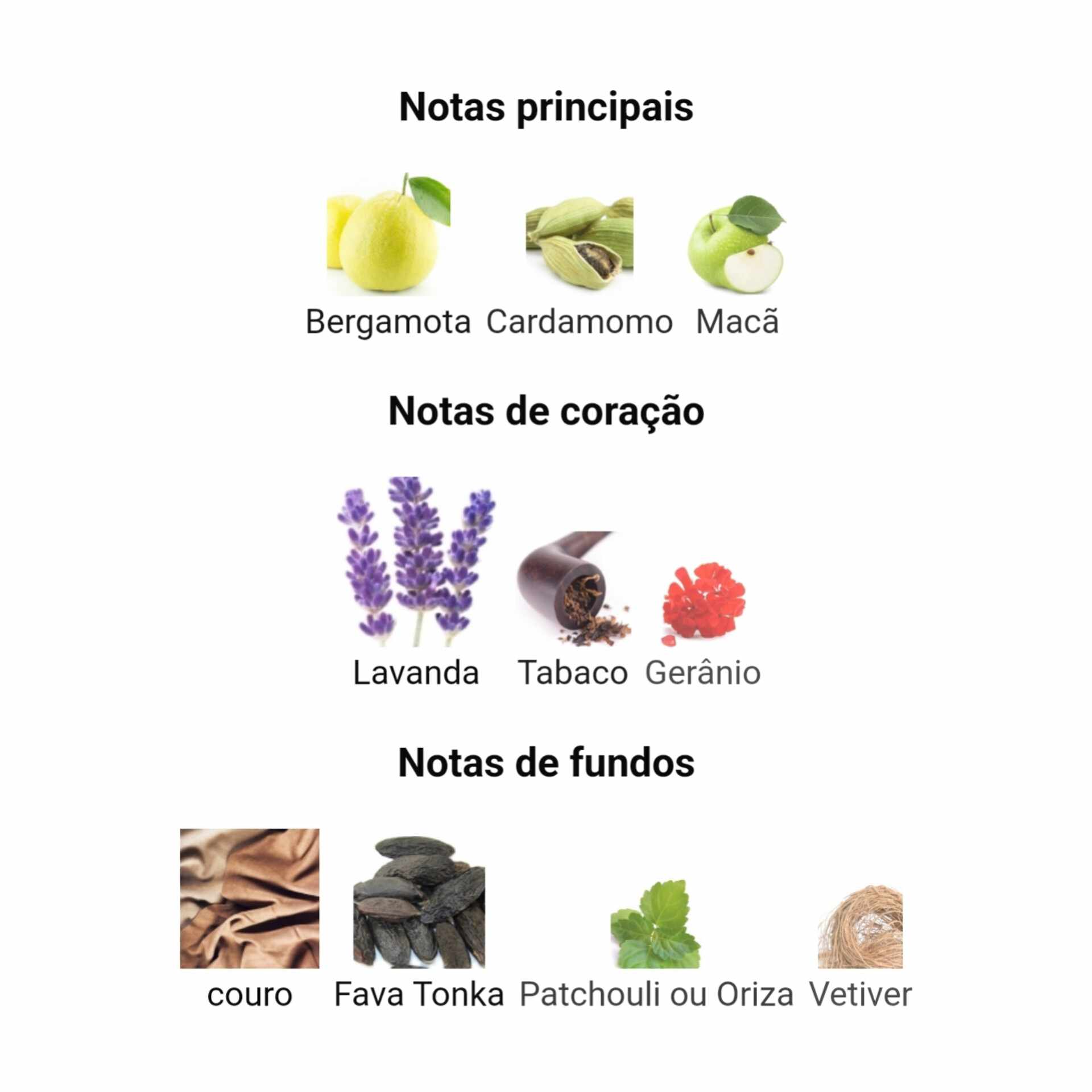 Possui notas de topo são bergamota, cardamomo e maçã, as notas de coração são Lavanda, Tabaco e Gerânio; como notas de fundo vigoroso, fava tonka, patchouli e vetiver.