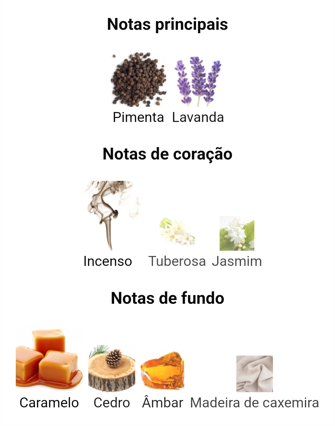 As notas de topo são pimenta e lavanda; as notas de coração são Incenso, Tuberosa e Jasmim; As notas de fundo são caramelo, cedro, âmbar e madeira de caxemira.
