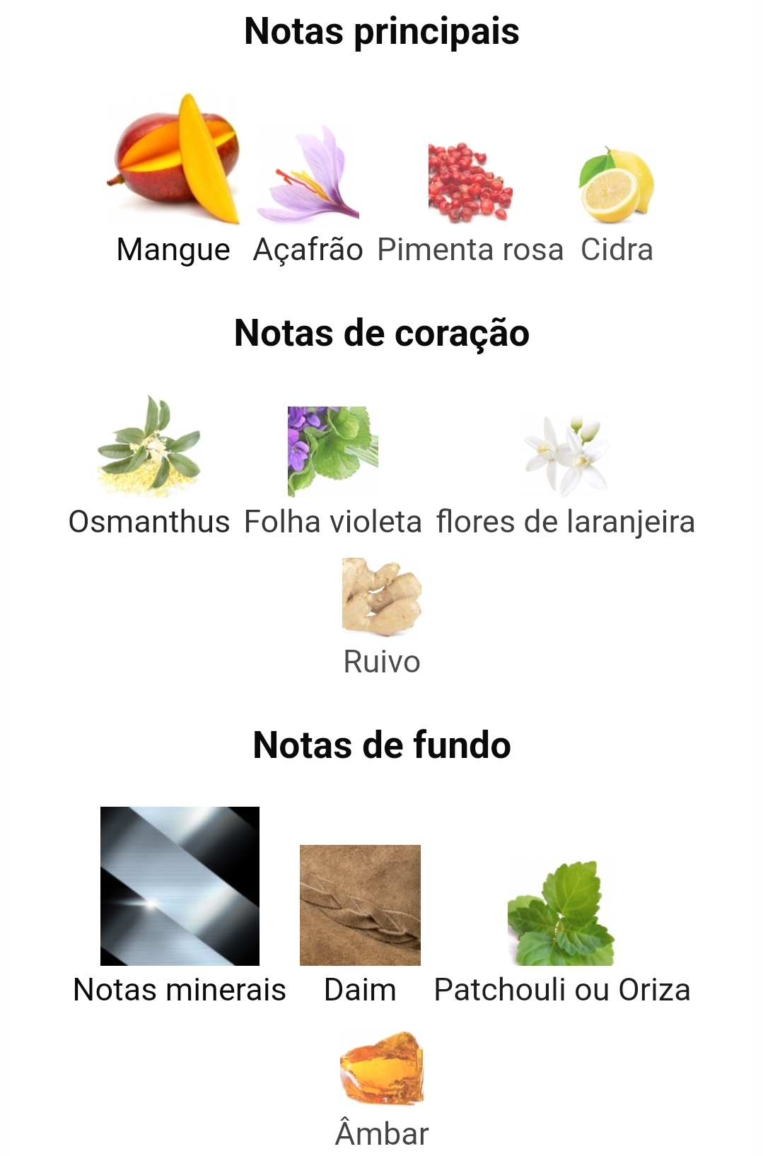As notas de topo são manga, açafrão, pimenta rosa e limão; as notas de coração são osmanthus, folha de violeta, flor de laranjeira e gengibre; as notas de fundo são notas minerais, camurça, patchouli e âmbar.