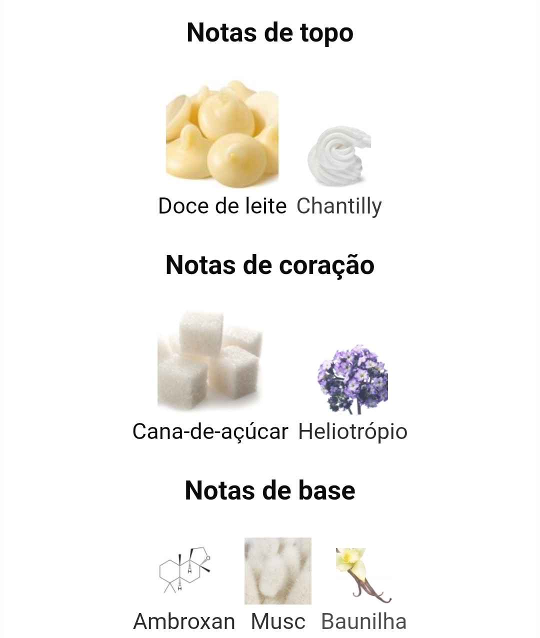 As notas de topo são Doce de Leite e Chantilly; as notas de coração são Cana-de-Açúcar e Heliotrópio; as notas de fundo são Ambroxan, Almíscar e Baunilha.