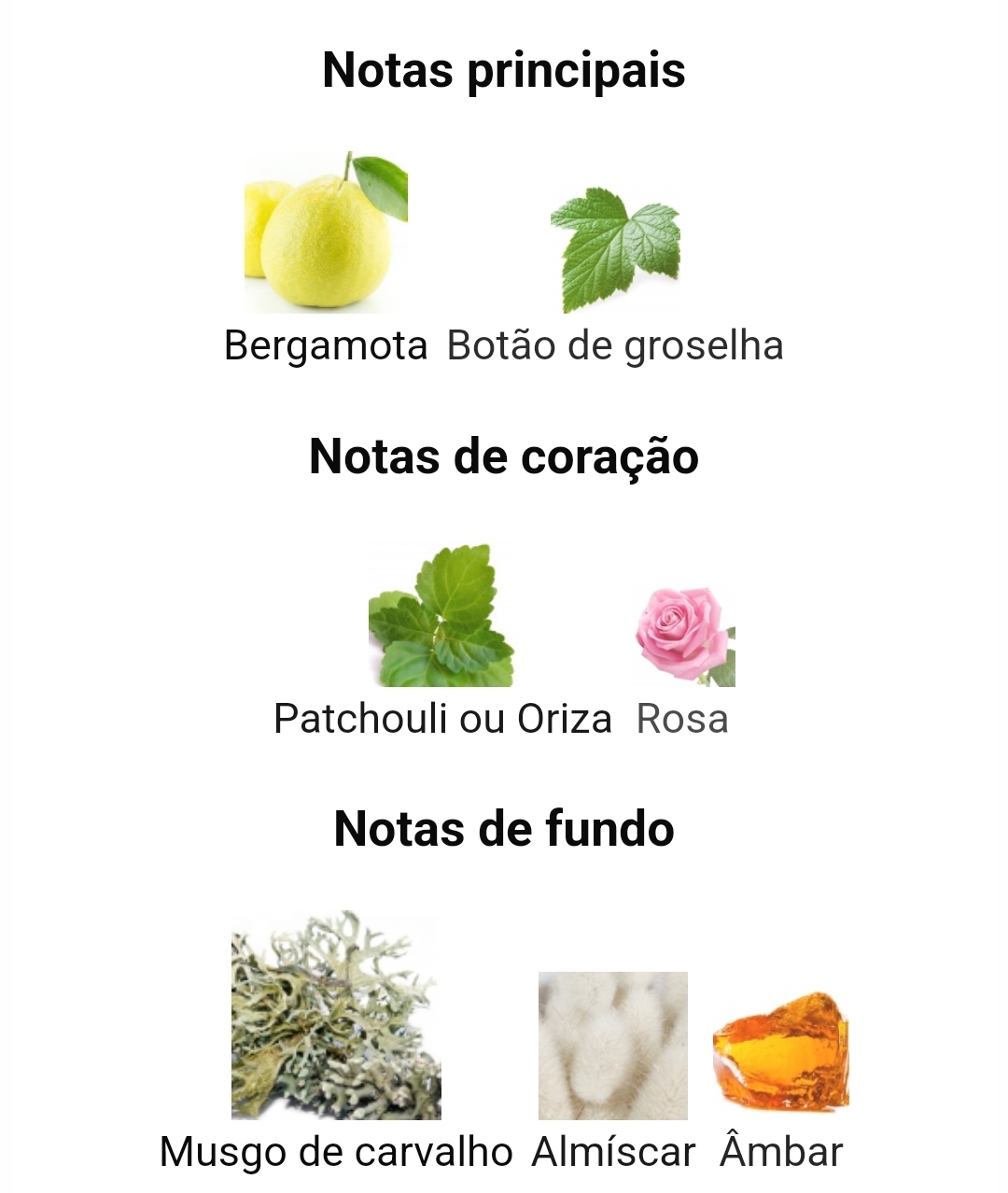 As notas de topo são bergamota e groselha preta; as notas de coração são Patchouli e Rosa; As notas de fundo são Musgo de Carvalho, Almíscar e Âmbar.