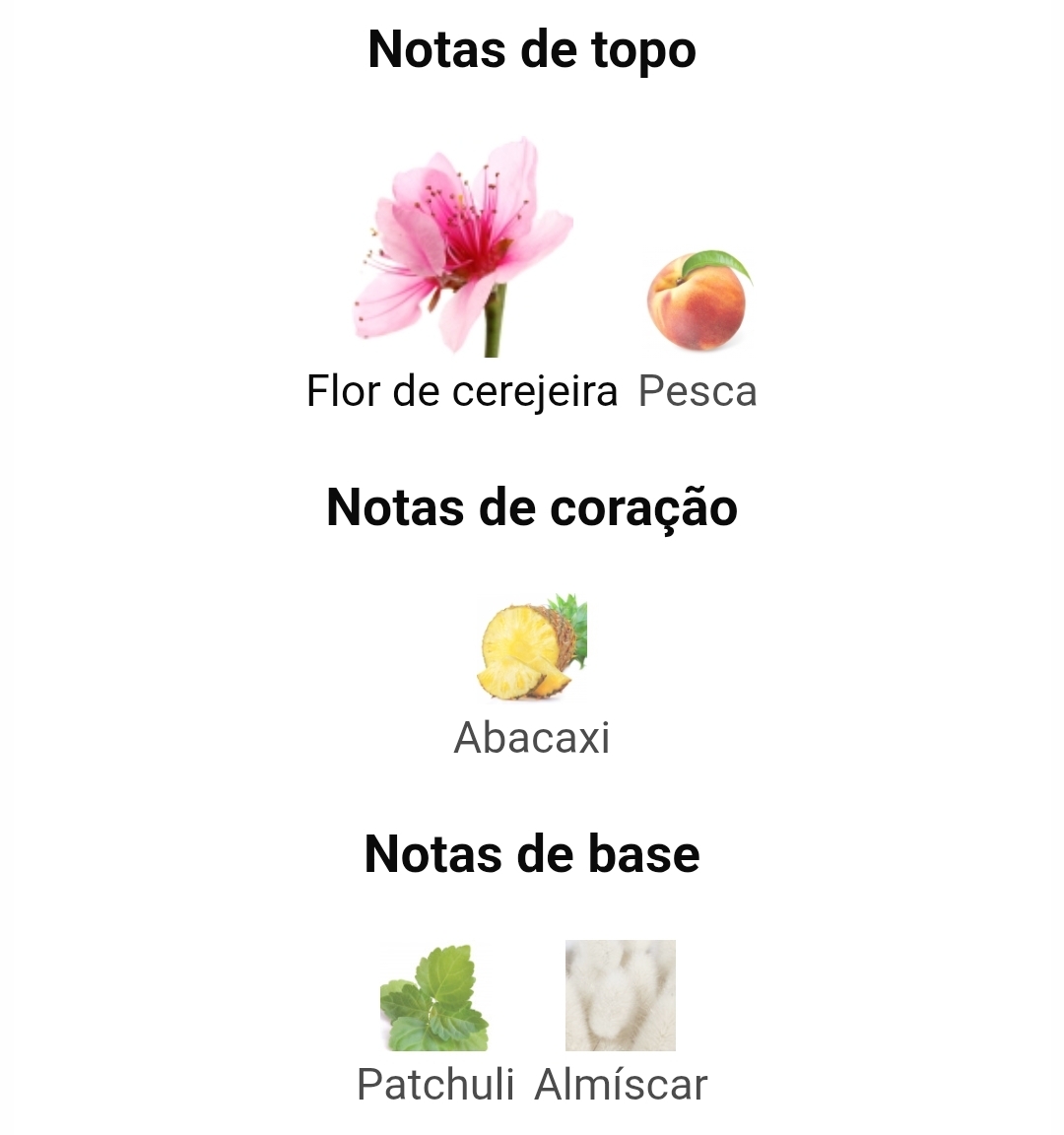 Notas olfativas de perfume com ícones de flor de cerejeira, pêssego, abacaxi, patchuli e almíscar