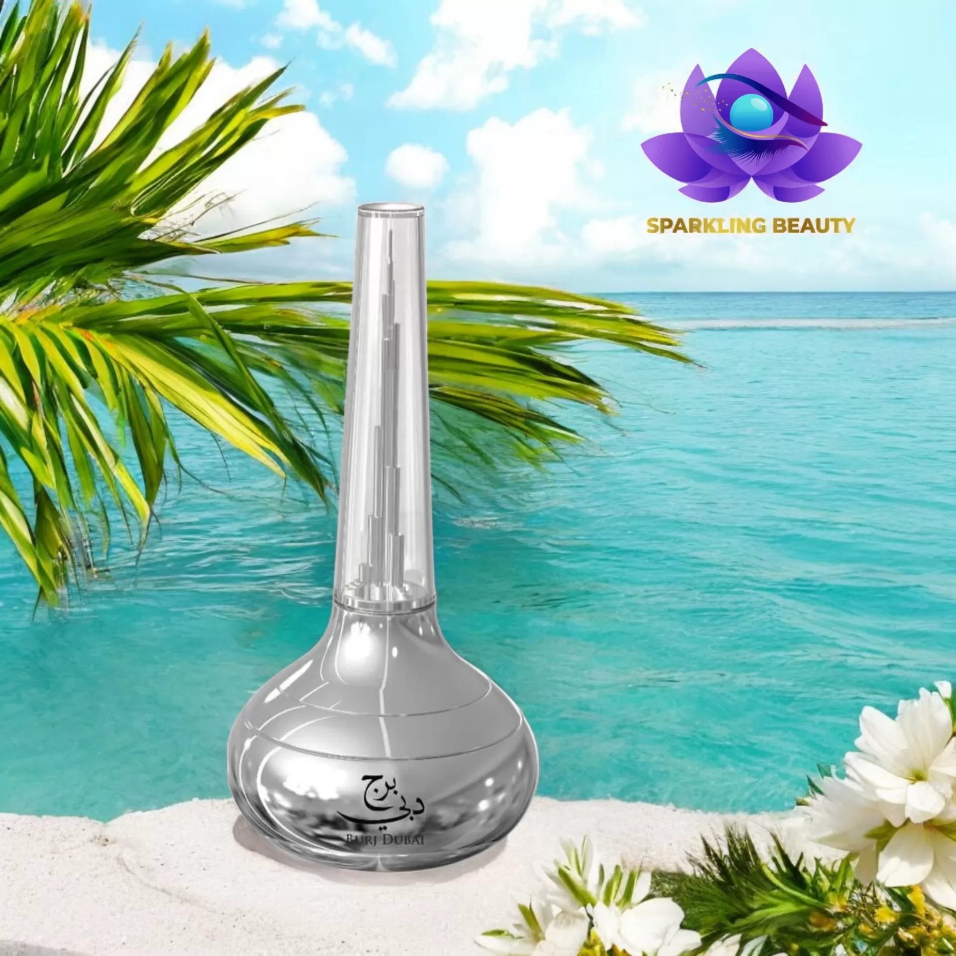Frasco e caixa do perfume Burj Dubai com design elegante e fundo natural com piscina e flores.