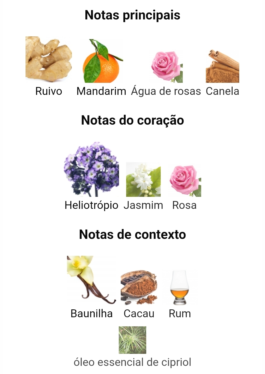 As notas de topo são gengibre, tangerina, água de rosas e canela; as notas de coração são heliotrópio, jasmim e rosa; e as notas de fundo são baunilha, cacau, rum e óleo de cipriol.