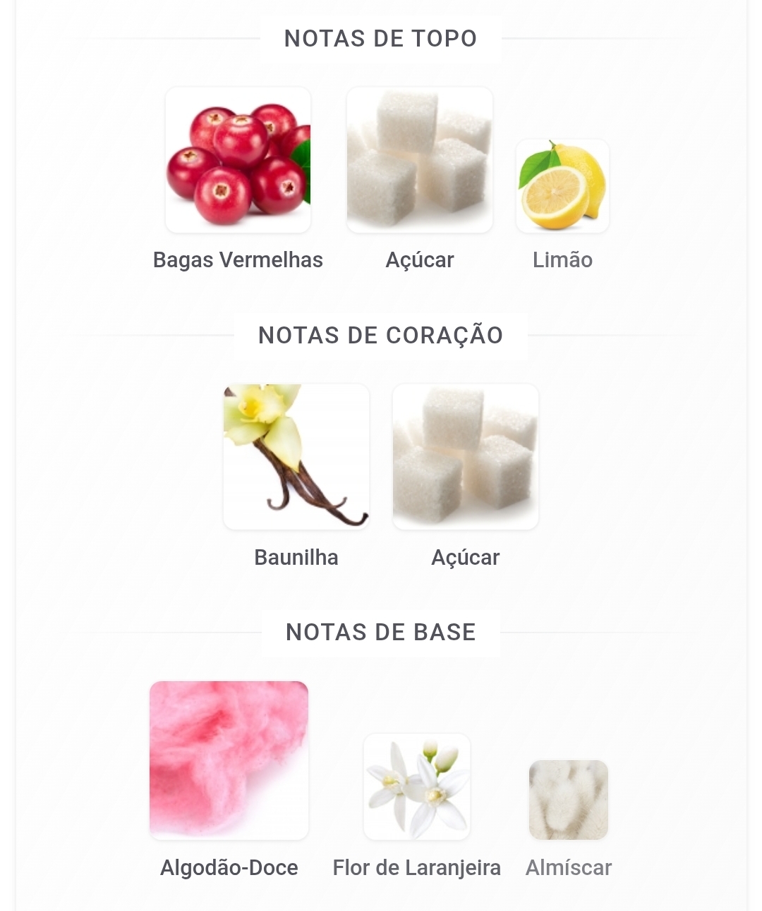 As notas de topo são: Bagas Vermelhas, Açúcar e Limão. As notas de coração são: Baunilha e Açúcar. As notas de fundo são: Algodão-Doce, Flor de Laranjeira e Almíscar.