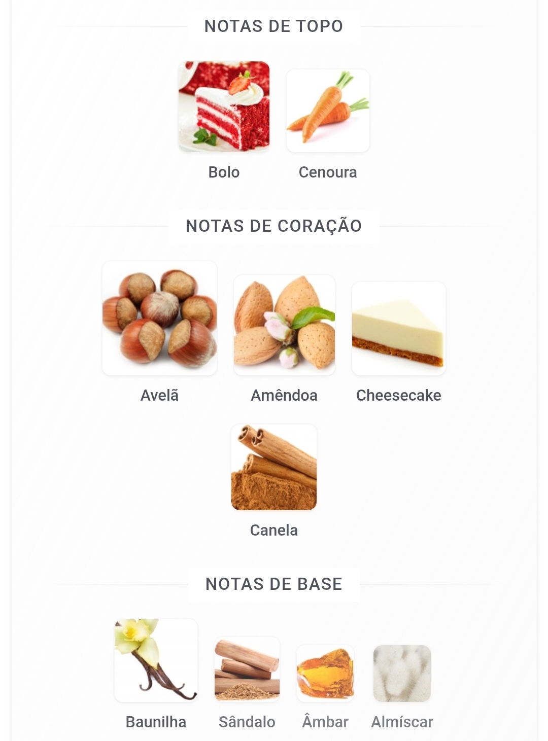 As notas de topo são: Bolo e Cenoura. As notas de coração são: Avelã, Amêndoa, Cheesecake e Canela. As notas de fundo são: Baunilha, Sândalo, Âmbar e Almíscar