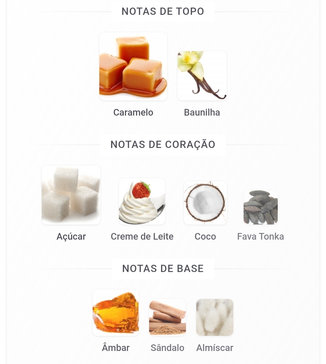 As notas de topo são: Caramelo e Baunilha. As notas de coração são: Açúcar, Creme de Leite, Coco e Fava Tonka. As notas de fundo são: Âmbar, Sândalo e Almíscar.