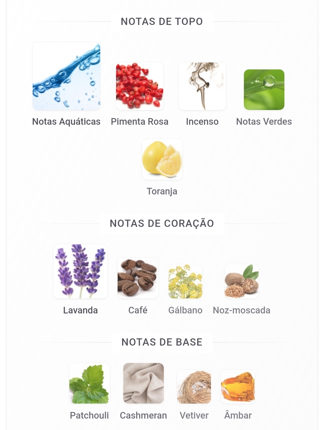 As notas de topo são: Notas Aquáticas, Pimenta Rosa, Incenso, Notas Verdes e Toranja. As notas de coração são: Lavanda, Café, Gálbano e Noz-moscada. As notas de fundo são: Patchouli, Cashmeran, Vetiver e Âmbar.