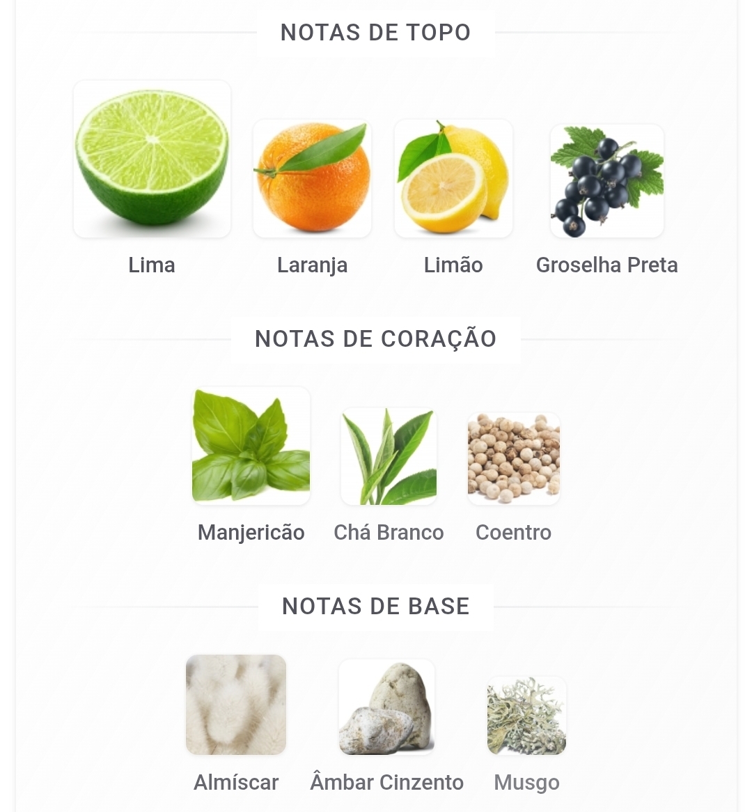 As notas de topo são: Lima, Laranja, Limão e Groselha Preta. As notas de coração são: Manjericão, Chá Branco e Coentro. As notas de fundo são: Almíscar, Âmbar Cinzento e Musgo.
