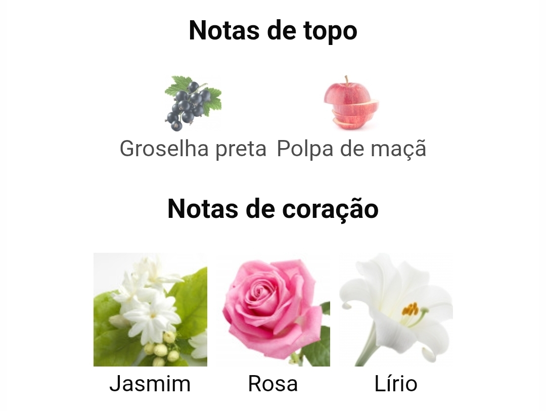 Notas de topo: Groselha preta e Polpa de maçã, Notas de coração: Jasmim, Rosa, Lírio