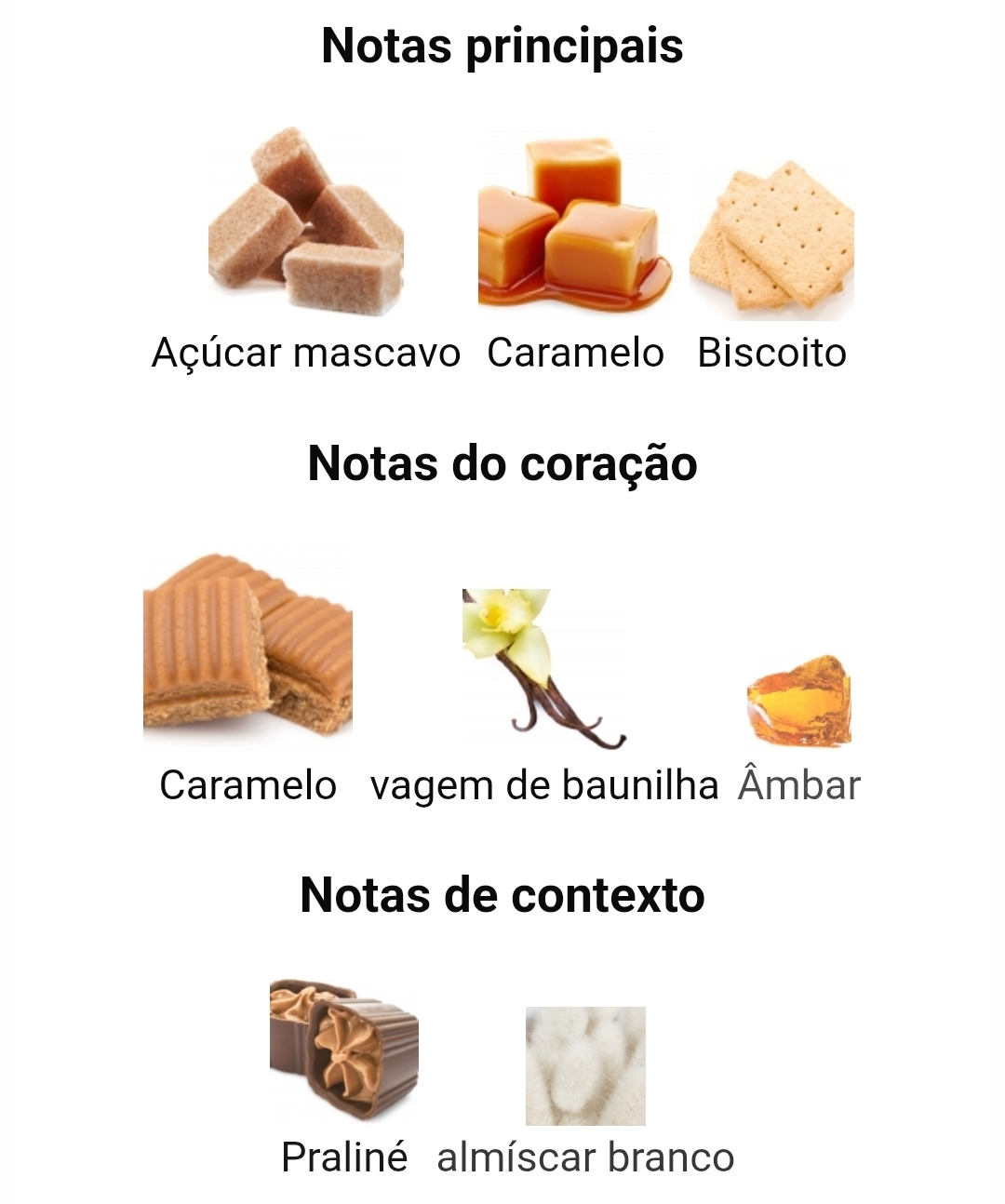 As notas de topo são açúcar mascavo, caramelo e biscoito; as notas de coração são caramelo toffee, baunilha e âmbar; as notas de fundo são praliné e almíscar branco.