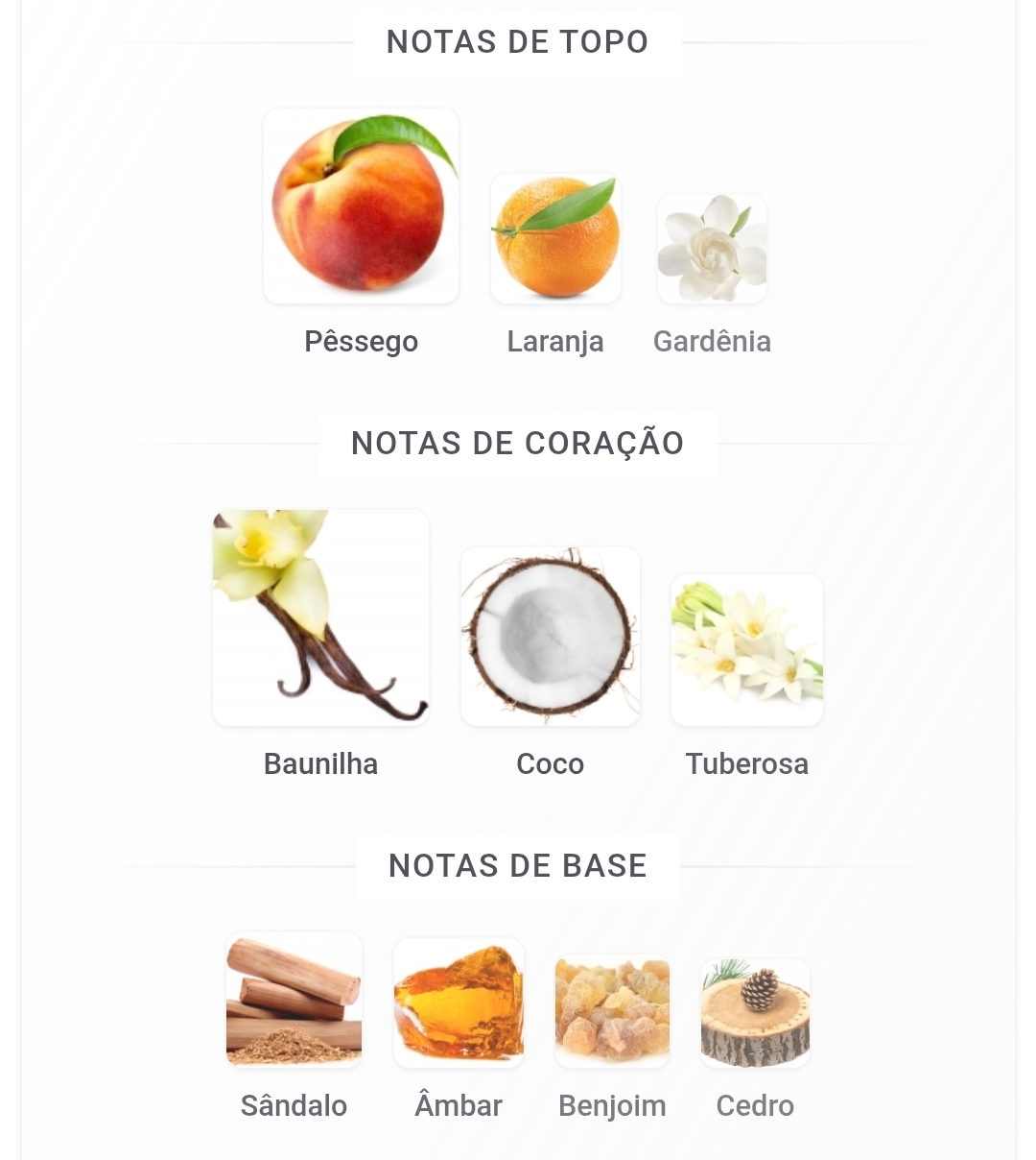 As notas de topo são: Pêssego, Laranja e Gardênia. As notas de coração são: Baunilha, Coco e Tuberosa. As notas de fundo são: Sândalo, Âmbar, Benjoim e Cedro.