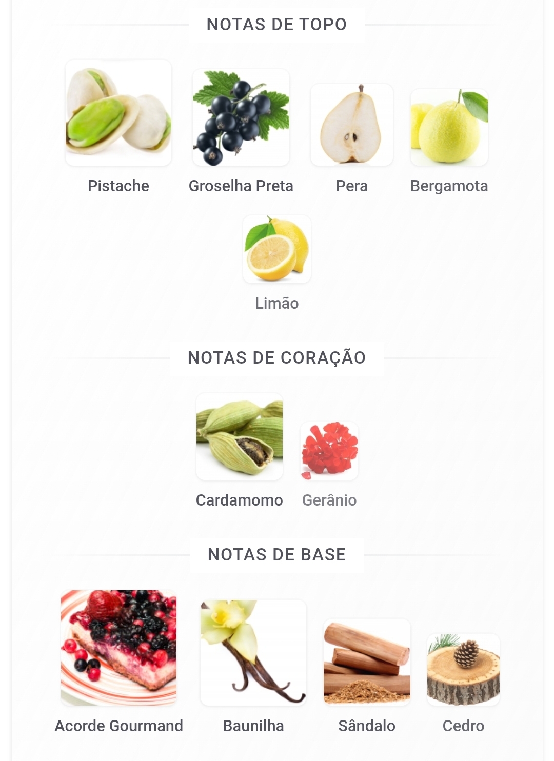 As notas de topo são: Pistache, Groselha Preta, Pera, Bergamota e Limão. As notas de coração são: Cardamomo e Gerânio. As notas de fundo são: Acorde Gourmand, Baunilha, Sândalo e Cedro.
