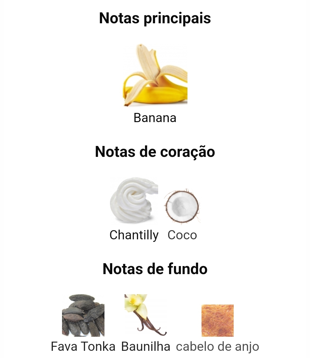 A nota de topo é Banana; as notas de coração são chantilly e coco; as notas de fundo são fava tonka, baunilha e cabelo de anjo.