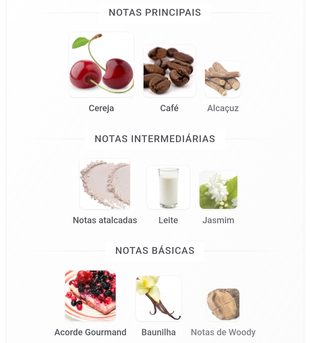 As notas de topo são Cereja, Café e Alcaçuz; as notas de coração são Notas Atalcadas, Leite e Jasmim; as notas de fundo são Acorde Gourmand, Baunilha e Notas Amadeiradas.