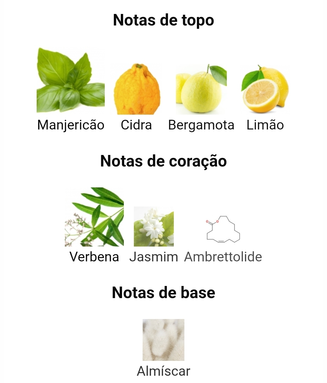 As notas de topo são manjericão, cidra, bergamota e limão; as notas de coração são verbena, jasmim e ambrettolida; a nota de fundo é almíscar.