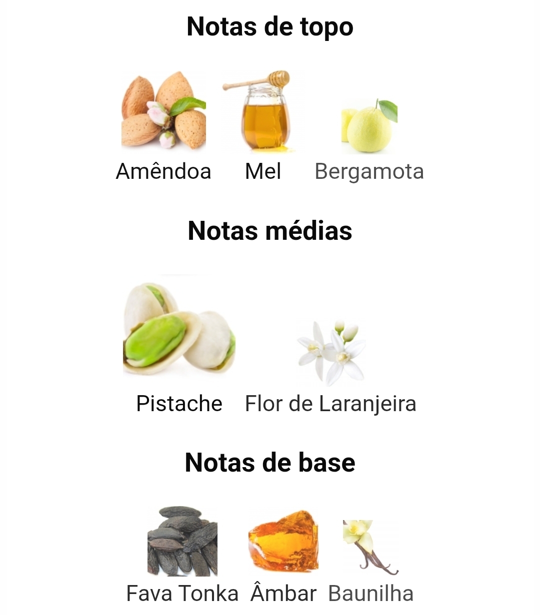 As notas de topo são amêndoa, mel e bergamota; as notas de coração são pistache e flor de laranjeira; as notas de fundo são fava tonka, âmbar e baunilha