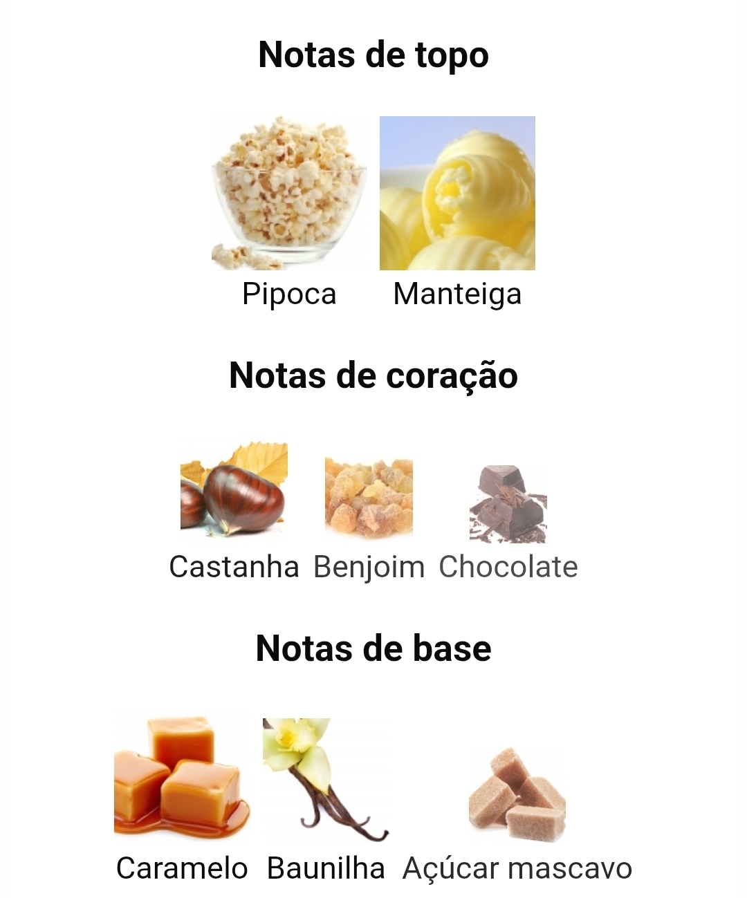 As notas de topo são pipoca e manteiga; as notas de coração são castanha, benjoim e chocolate; as notas de fundo são caramelo, baunilha e açúcar mascavo.