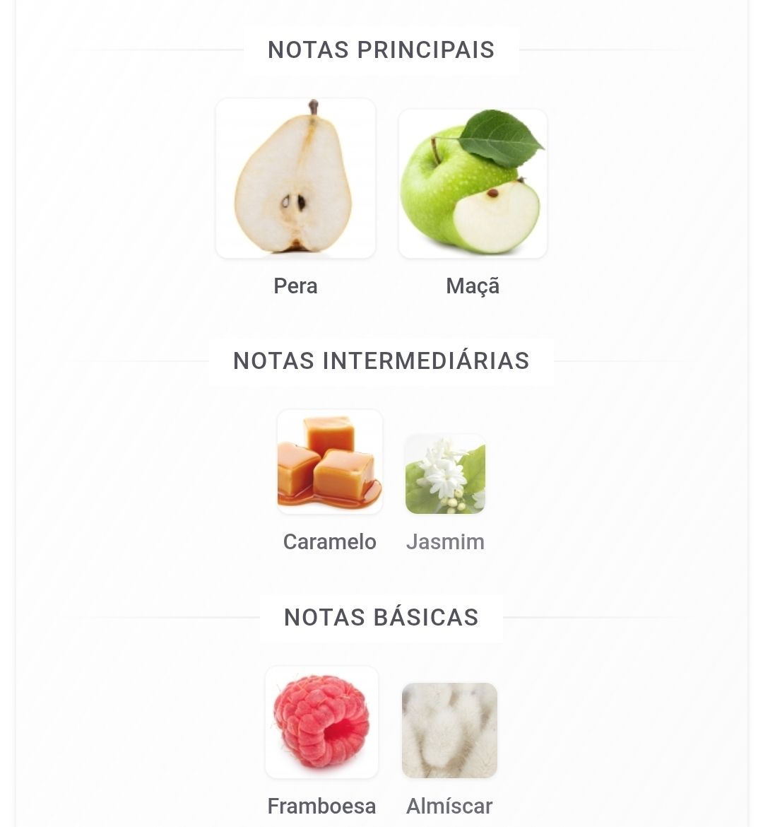 As notas de topo são pera e maçã; as notas de coração são caramelo e jasmim; e as notas de fundo são framboesa e almíscar.