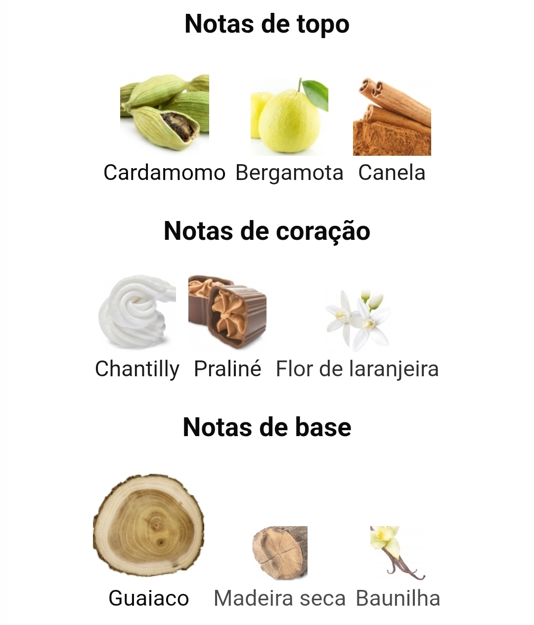 As notas de topo são cardamomo, bergamota e canela; as notas de coração são chantilly, pralinê e flor de laranjeira; as notas de fundo são madeira guaiac, madeira seca e baunilha.