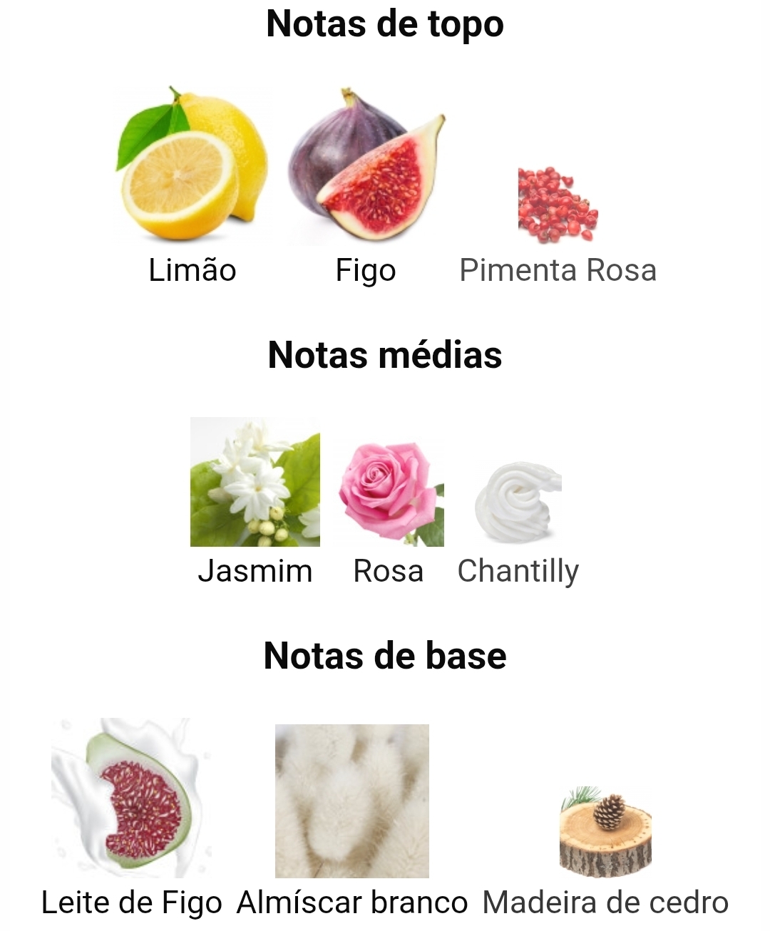 As notas de topo são Limão, Figo e Pimenta Rosa; as notas de coração são Jasmim, Rosa e Chantilly; as notas de fundo são Leite de Figo, Almíscar Branco e Cedro.