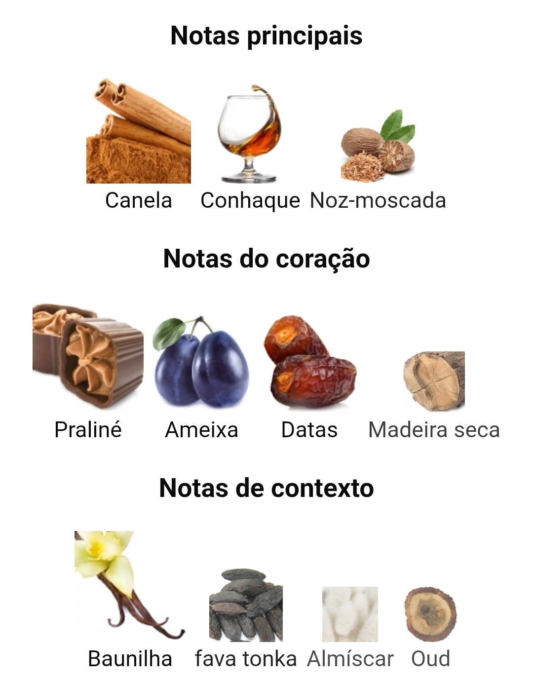 As notas de topo são canela, conhaque e noz-moscada; as notas de coração são praliné, ameixa, tâmaras e madeiras secas; as notas de fundo são baunilha, fava tonka, almíscar e oud.