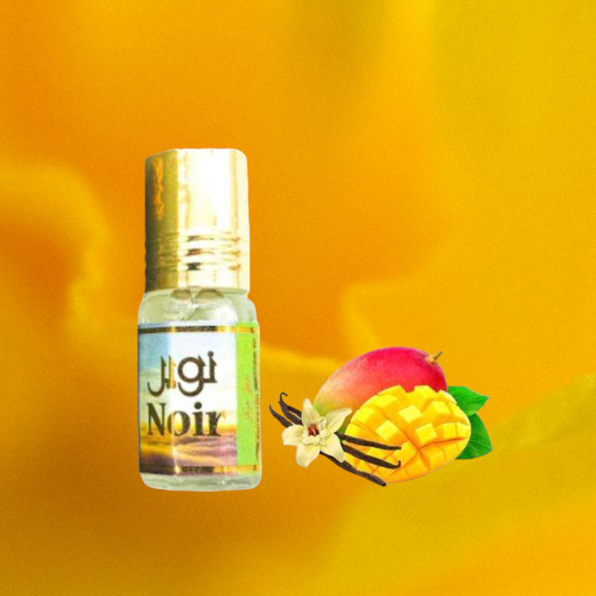 Frasco pequeno de perfume 'Noir' com tampa dourada e ilustração de manga e baunilha