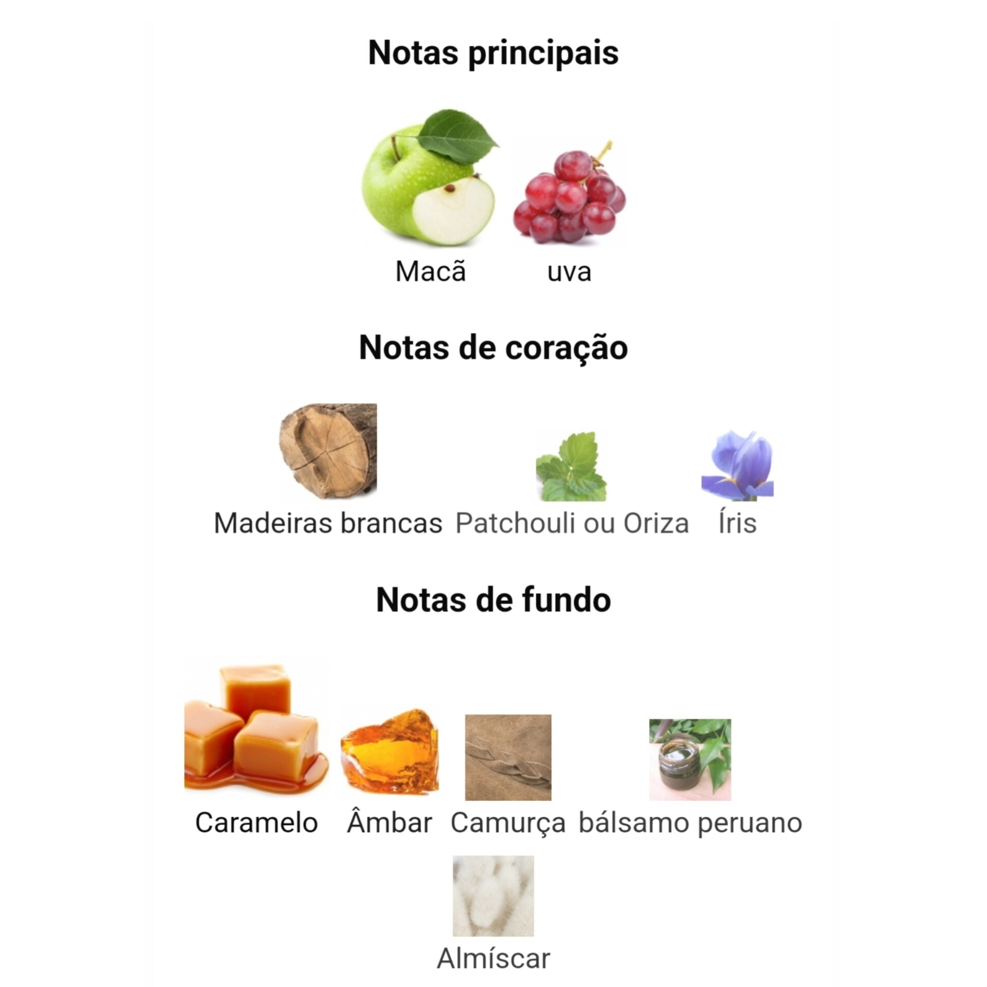 As notas de topo são maçã e uva; como notas de coração feitas de branco, patchouli e íris; Conforme notado pelo fundo de Caramelo, Ambar, Camurça, Bálsamo Peruano e Almíscar.