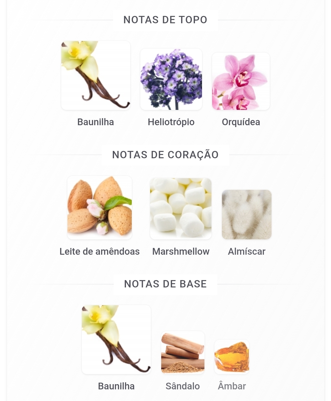 As notas de topo são: Baunilha, Heliotrópio e Orquídea. As notas de coração são: Leite de amêndoas, Marshmellow e Almíscar. As notas de fundo são: Baunilha, Sândalo e Âmbar.